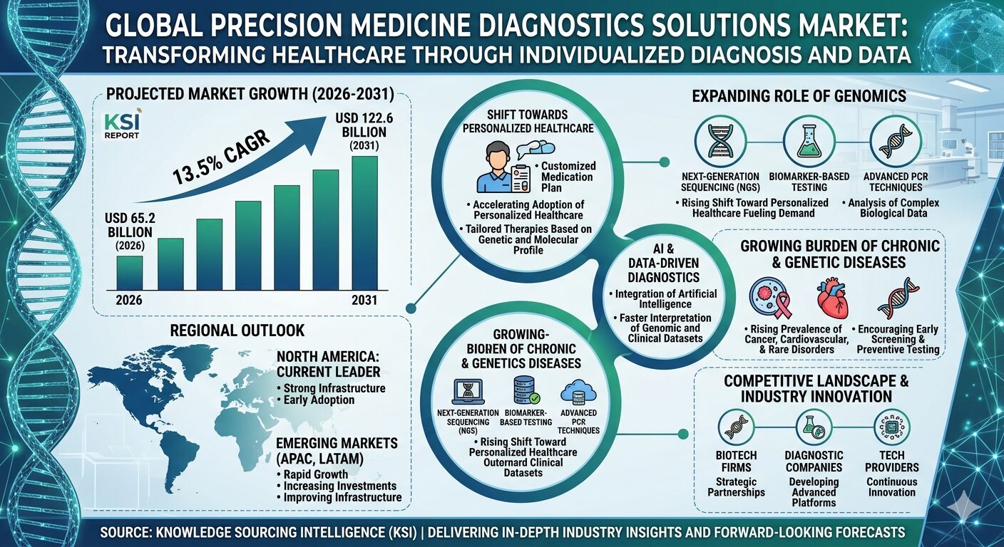 Noida, India — April 24, 2026 — The global Precision Medicine Diagnostics Solutions Market is undergoing a significant transformation, driven by the accelerating adoption of personalized healthcare, advancements in genomic technologies, and the rising demand for accurate disease diagnosis. According to a recent report by Knowledge Sourcing Intelligence (KSI), the market is projected to grow from USD 65.2 billion in 2026 to USD 122.6 billion by 2031, registering a strong CAGR of 13.5%.