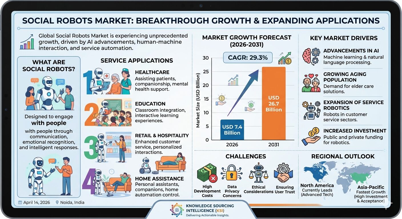 Noida, India — April 14, 2026 — The global Social Robots Market is entering a high-growth phase as industries increasingly adopt intelligent, interactive machines to enhance human engagement and service delivery. According to a recent study by Knowledge Sourcing Intelligence (KSI), the Social Robots Market is projected to grow from USD 7.4 billion in 2026 to USD 26.7 billion by 2031, advancing at a remarkable CAGR of 29.3%.